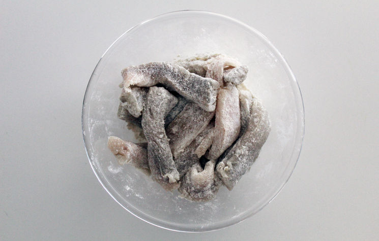 The chips go first, fried in batches until golden and crisp before being transferred to the oven to keep warm. Then comes the fish. I was surprised by the instruction to cut the fillets into 10cm by 2cm strips, much smaller than the usual fish shop size, but followed along. Each piece is dipped in batter, excess shaken off, and gently lowered into the hot oil until golden and crunchy.