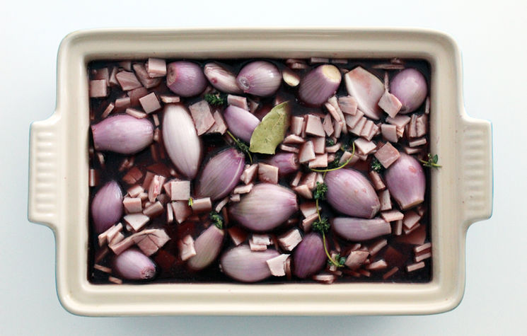 Olive oil went into a casserole dish over high heat. First the bacon, then shallots, then mushrooms were browned one by one before being set aside. The heat felt a touch too high here, and I ended up with a bit more char on the bottom of the pot than I would have liked.