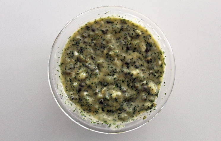 I started with Gary’s tartare sauce, a separate recipe in the book. I made my own mayonnaise base, then added gherkins, capers, herbs and seasoning. Gary’s twist is grating a hard-boiled egg into the mix, which adds a surprising texture.