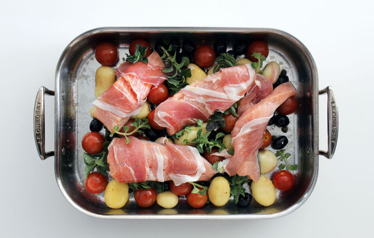 While the potatoes fried in a roasting tray on the stovetop, I tossed the rest of the ingredients - tomatoes, capers, olives, and more - in a bowl with olive oil and lemon juice. Once coated, the salmon fillets were removed and wrapped in prosciutto, making sure they were snugly covered.