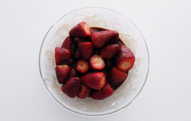 Once the short pastry was ready, I combined the strawberries in a bowl with sugar, balsamic vinegar, and cornflour to create a thick syrupy mixture that coated the fruit.